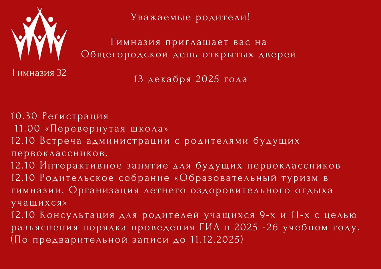 С 25 мая по 5 июня 2025 года учащиеся гимназии № 32 «Гимназия петербургской культуры» участвуют в международной смене Таншаньской Восточной образовательной группы города Таншань (КНР). Подробнее Команда гимназии заняла 3 место во Всероссийском конкурсе мультимедийных презентаций на иностранном языке Typish deutsch! Мы гордимся нашими талантливыми участниками: