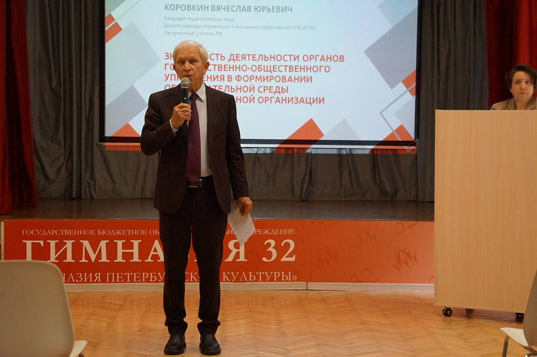 Семинар был посвящён взаимодействию образовательной организации и Попечительского совета. Его открыл кандидат педагогических наук, доцент кафедры управления и экономики образования Санкт-Петербургской академии постдипломного педагогического образования Вячеслав Юрьевич Коровкин. Выступив модератором мероприятия, он представил доклад о деятельности государственно-общественного управления в формировании образовательной среды учреждения.