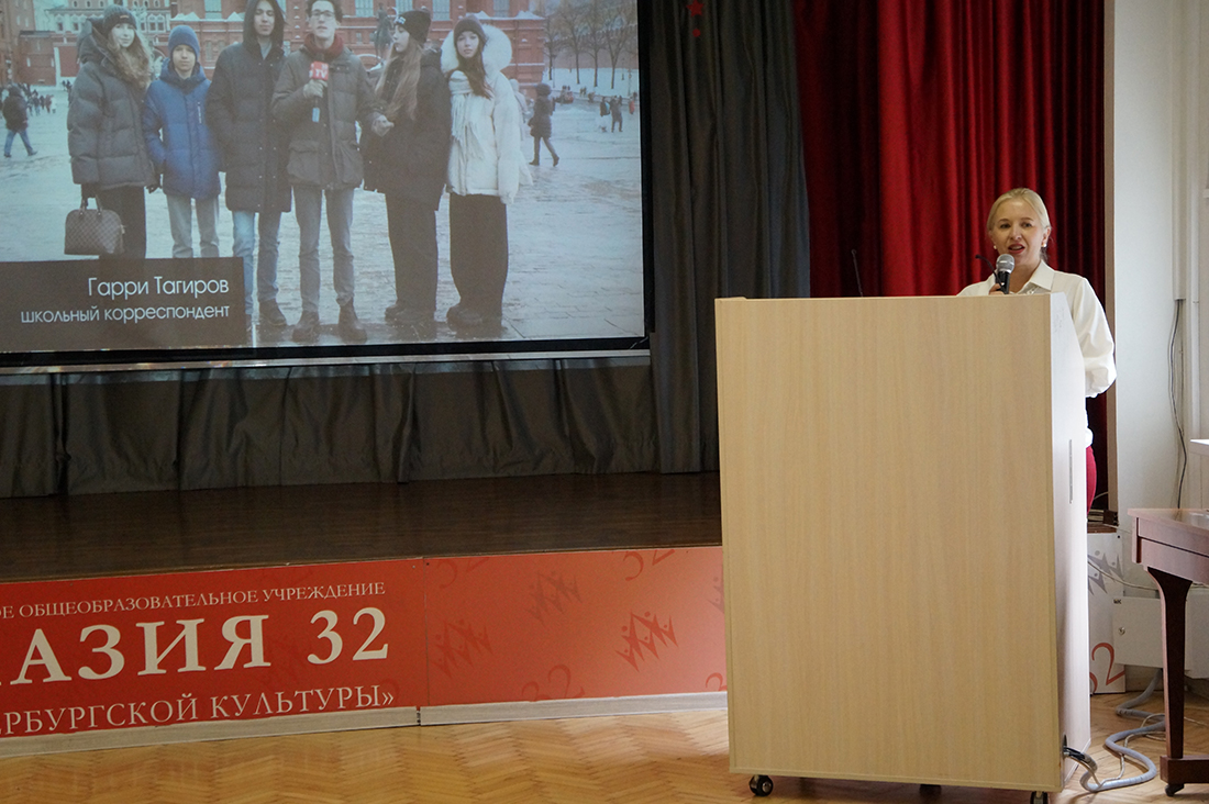 Оксана Викторовна Коршунова, директор гимназии № 32 «Гимназия петербургской культуры», поприветствовала гостей и поделилась опытом взаимодействия участников образовательного процесса в создании благоприятной среды на примере создание медиакласса гимназии, а именно рассказала о выпускаемом глянцевом журнале и съемках видеорепортажей. О роли Попечительского совета продолжила рассказывать председатель Совета Ирина Валерьевна Цегельник.