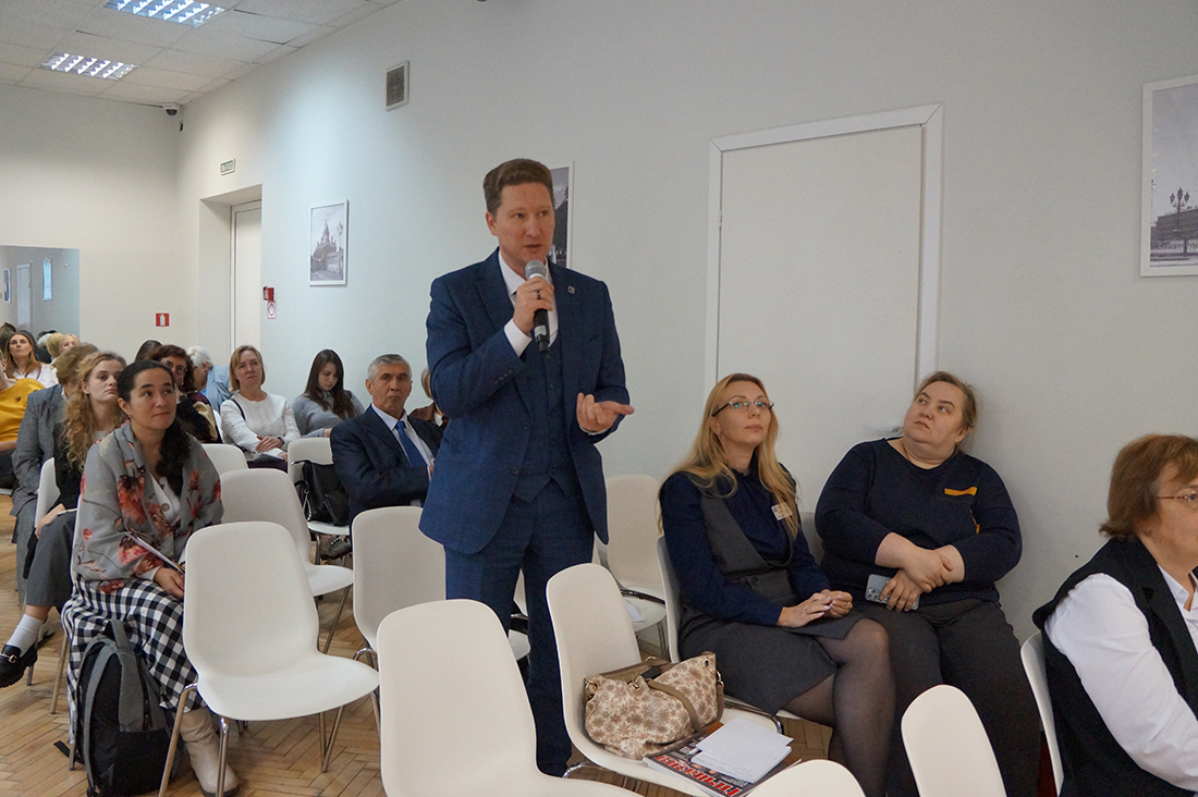 Семинар был посвящён взаимодействию образовательной организации и Попечительского совета. Его открыл кандидат педагогических наук, доцент кафедры управления и экономики образования Санкт-Петербургской академии постдипломного педагогического образования Вячеслав Юрьевич Коровкин. Выступив модератором мероприятия, он представил доклад о деятельности государственно-общественного управления в формировании образовательной среды учреждения.