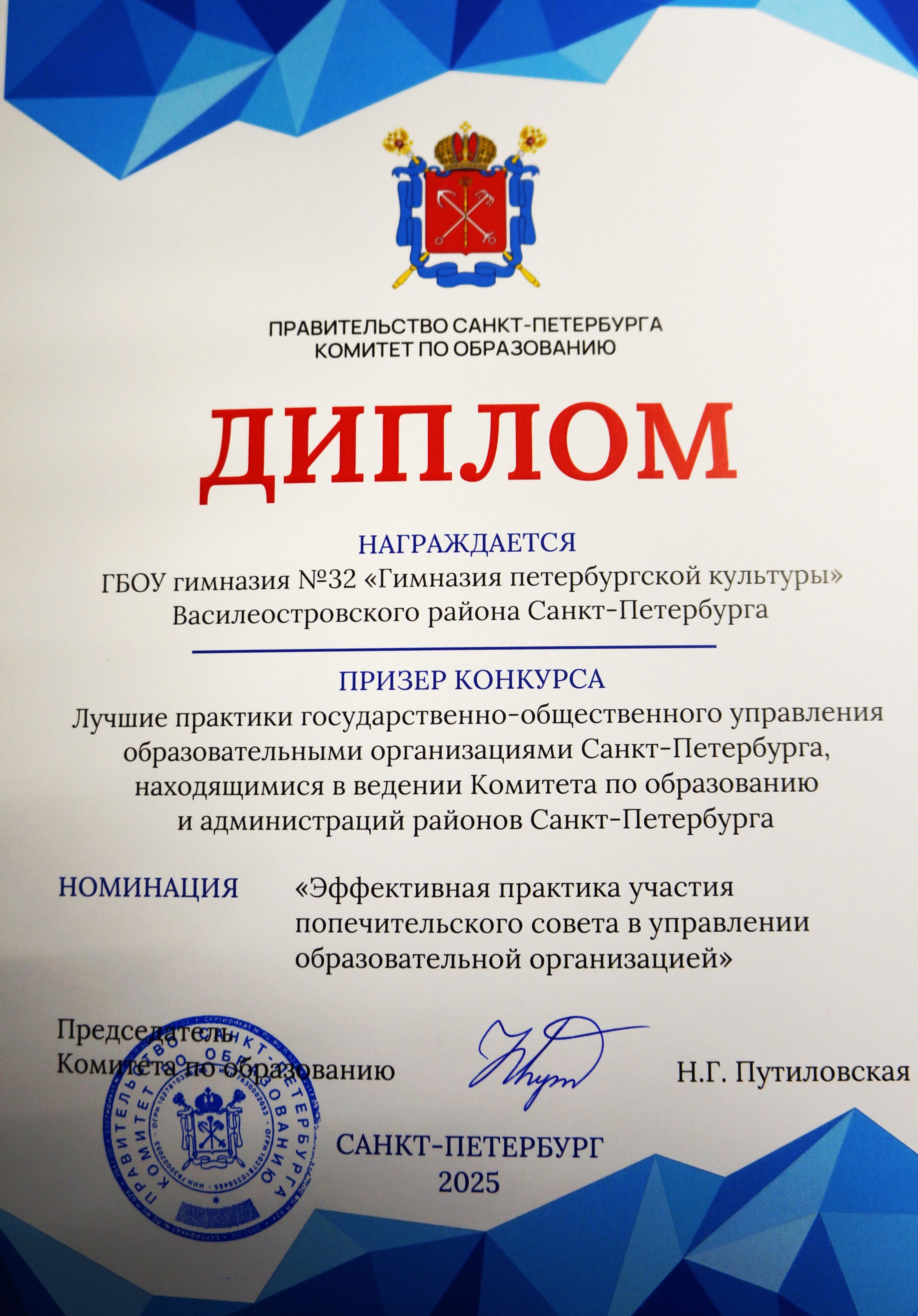 ГБОУ гимназия № 32 "Гимназия петербургской культуры" Санкт-Петербурга стала призером конкурса в номинации "Эффективная практика участия попечительского совета в управлении образовательной организацией". Этот успех подчеркивает важность совместной работы родителей и педагогов, направленной на совершенствование образовательного процесса и создание комфортной среды для учащихся.
